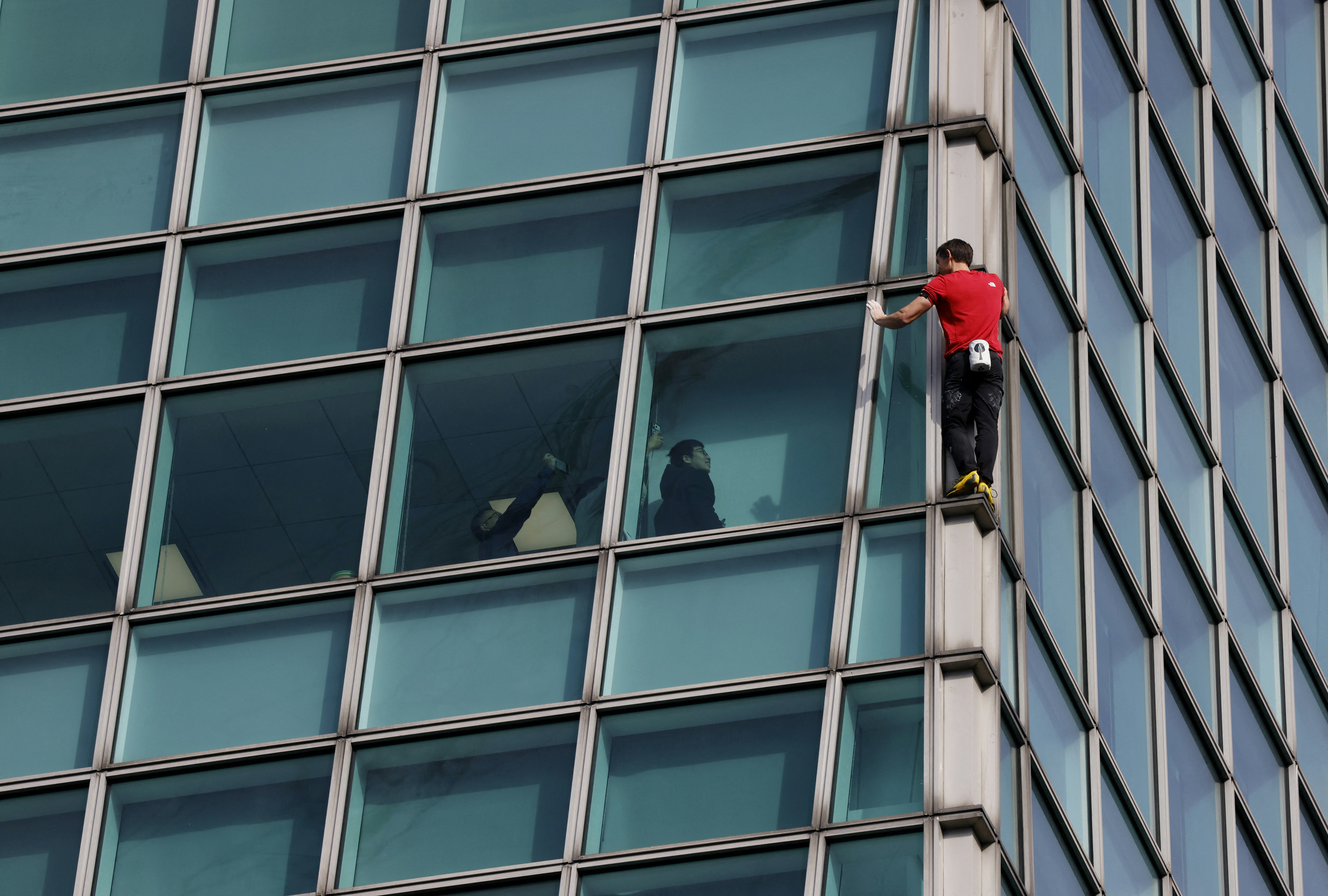 霍诺德25日上午攀爬台北101。(路透社)