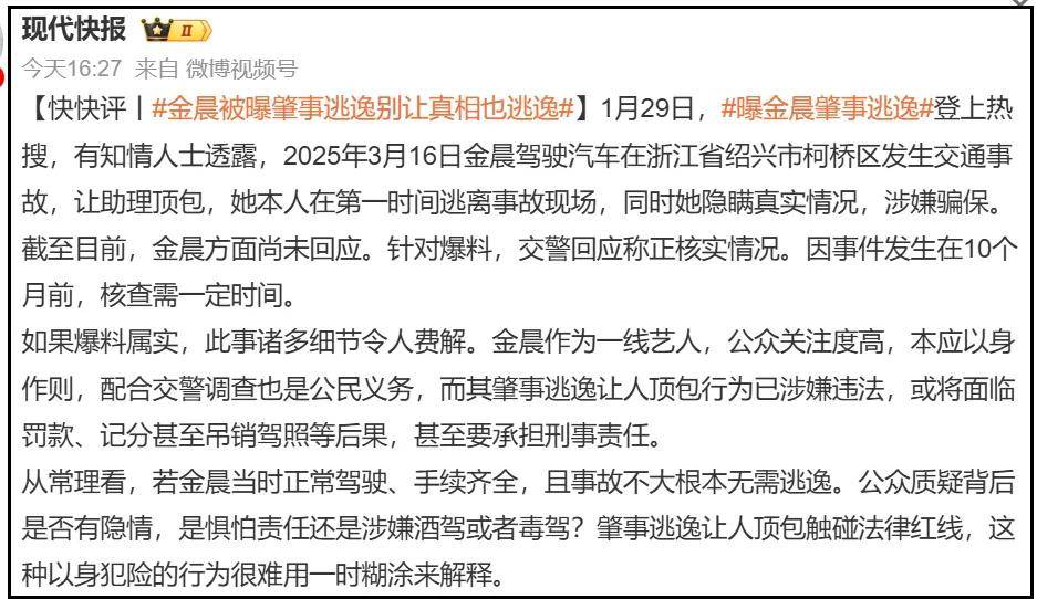 ——“從常理看,若金晨當時正常駕駛、手續齊全,且事故不大根本無需逃逸。公眾質疑背後是否有隱情,是懼怕責任還是涉嫌酒駕或者毒駕?肇事逃逸讓人頂包觸碰法律紅線,這種以身犯險的行為很難用一時糊塗來解釋。”