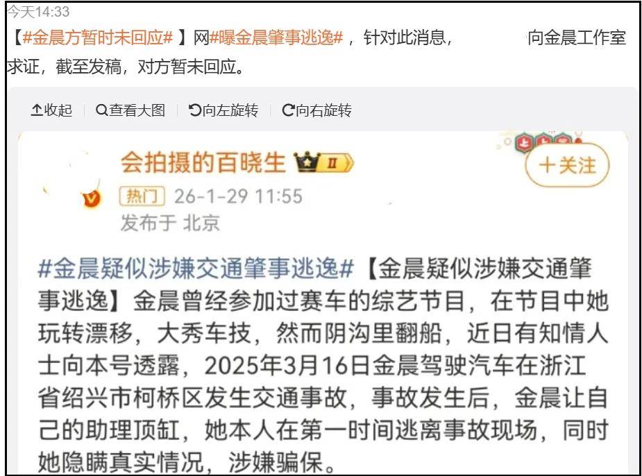 官媒發聲!質疑金晨涉嫌酒駕或毒駕,本人沉默