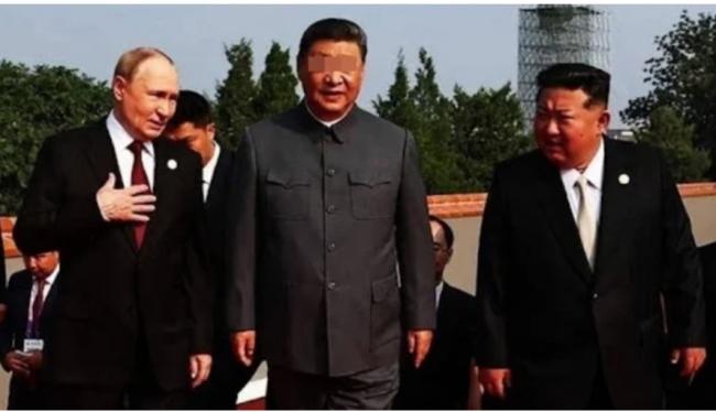 中共党魁习近平(中)、俄罗斯总统普京(左)和朝鲜领袖金正恩(右)于2025年9月3日登上天安门城楼。(视频截图)