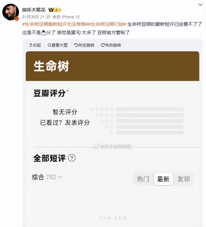 不過,胡歌和楊紫的粉絲已經在強調“黑水打壓”。目前,豆瓣上的《生命樹》已經不讓看短評,應該是片方要求鎖分了!
