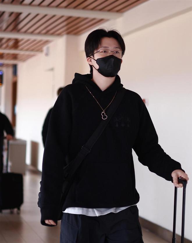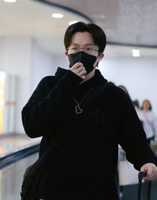 他穿了整套黑色运动装,线条干净利落,一副细边眼镜架在鼻梁上,那股子冷峻的文艺气息直接拉满。 最显眼的,还是他脖子上那条标志性的麒麟项链,在机场灯光下闪着细碎的光。
