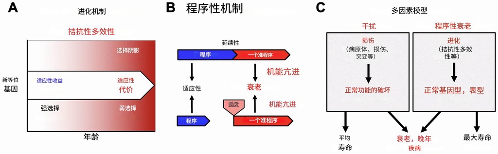 在进化的视野中,许多基因都具有多重效应。如果一个基因变体在生命早期能提高繁殖竞争力,但在晚年却会带来副作用,自然选择往往会为了早期的利益而保留它,从而导致衰老。已故科学家 Misha Blagosklonny 曾提出一个核心观点:衰老不是因为零件损耗,而是因为某些在早期非常有用的生理程序在晚年没有及时“关机”,反而过度运作,他称之为“准程序性过度功能”。