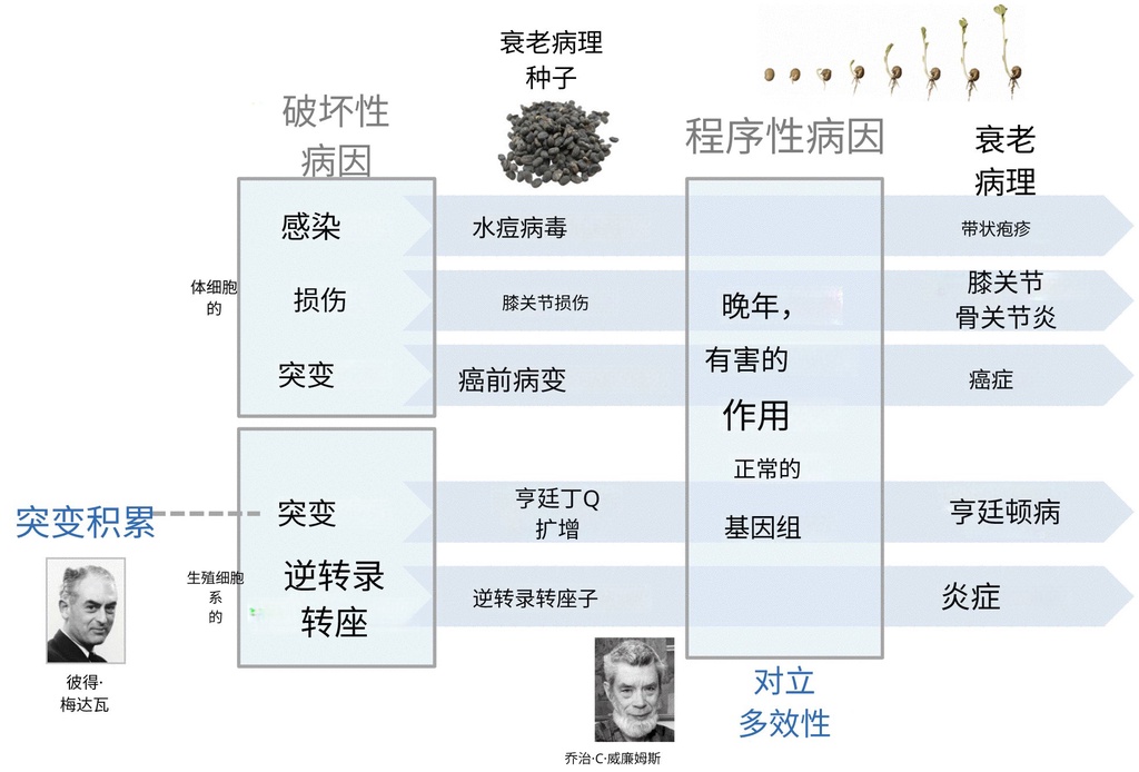 基于这一理论,研究者们提出了一个“两阶段”发病模型。简单来说,我们可以把衰老相关的疾病看作是“种子”在“土壤”中发芽的过程。第一阶段发生在生命早期,各种外界的损伤,比如感染、机械创伤或基因突变,像种子一样被埋在身体里。在年轻且充满活力的生理环境下,这些损伤通常能被身体控制住,处于休眠状态。第二阶段则发生在晚年,当正常的基因程序开始失控、过度运作时,原本健康的生理环境变成了适合病变生长的土壤,那些潜伏的损伤就会重新活跃并爆发。