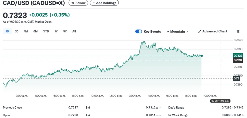 加拿大元上涨 0.5%,报 1.3645 加元兑 1 美元,折合 73.29 美分,此前曾触及 10 日低点 1.3724。本周累计下跌 0.2%。