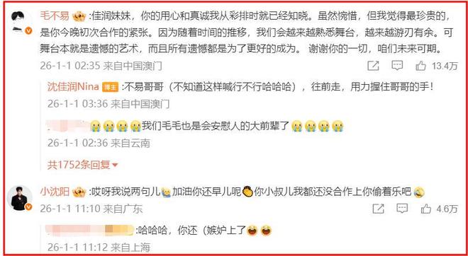 面對這種情況,小沈陽和毛不易都留言安慰了她。