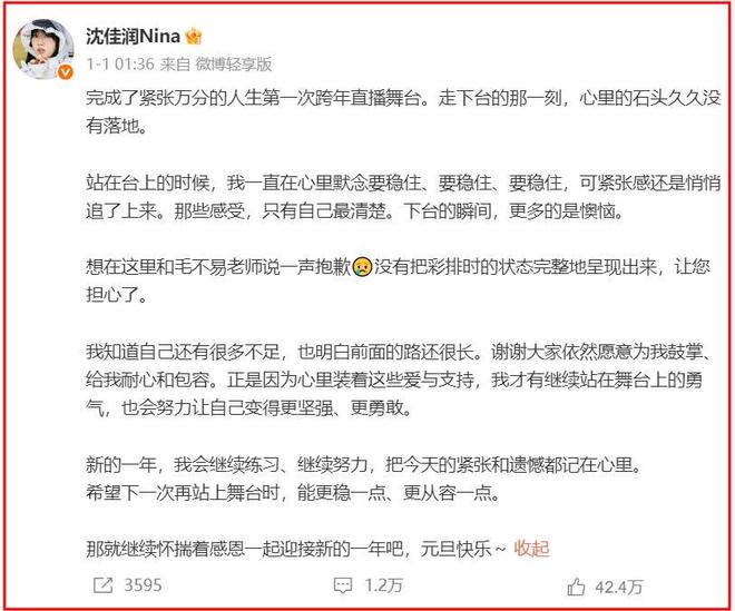 她說這是她人生中的第一次走上跨年直播舞台,在上台之前,她一直對自己說要穩住,但上台之後還是太緊張了,出現了失誤。