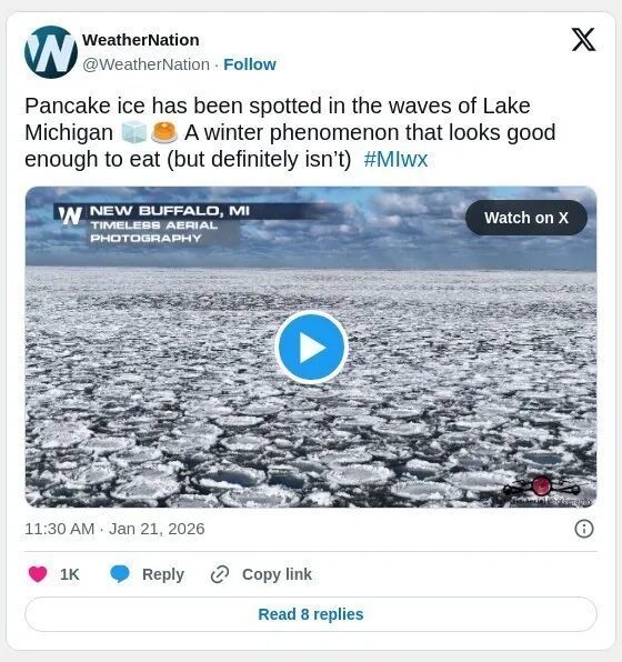 卡利表示:“今天气温略有回暖,冰煎饼正在消融。但到了周末,又会重新形成”。预计未来24小时的严寒与强风将为更多冰煎饼的出现创造完美条件。