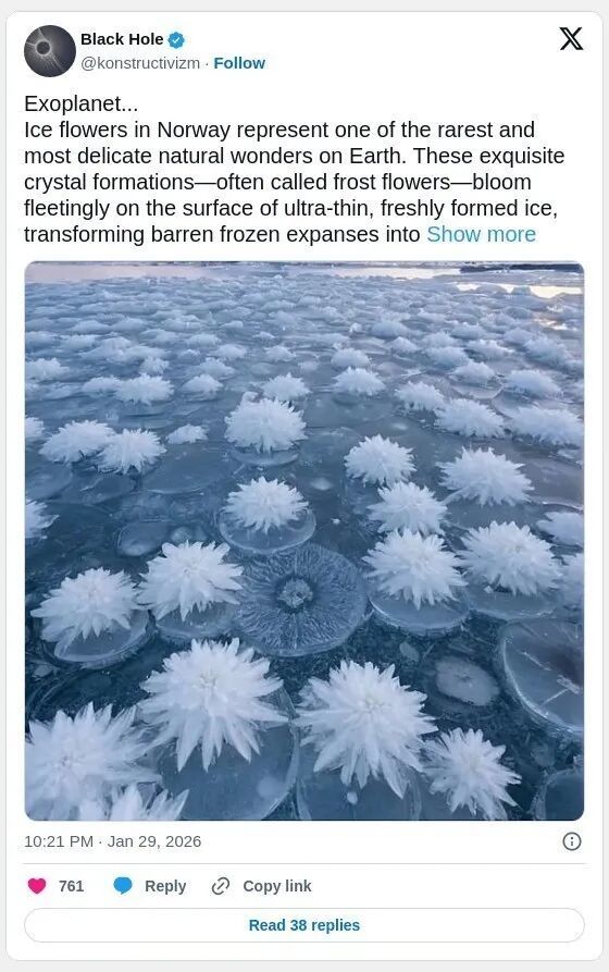 这种被称为“霜花”(frost flowers)的自然现象极为脆弱,也极为短暂,只会在特定气象条件下于新形成的超薄冰层表面“绽放”。