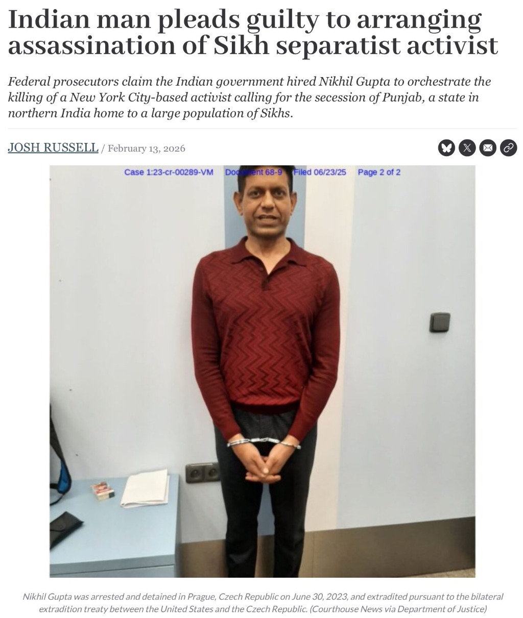 美国检方指控,Gupta 与印度政府相关人员合作,针对海外锡克分离主义者展开行动,其中包括2023年6月在加拿大素里市Guru Nanak Sikh Gurdwara外发生的枪击事件。该事件造成锡克领袖Hardeep Singh Nijjar身亡。