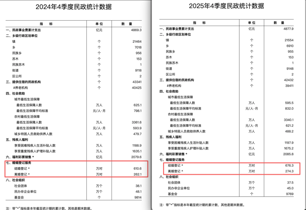 “民政部2月11日公布2025年婚姻登记数据,结婚登记676.3万对,离婚登记274.3万对。