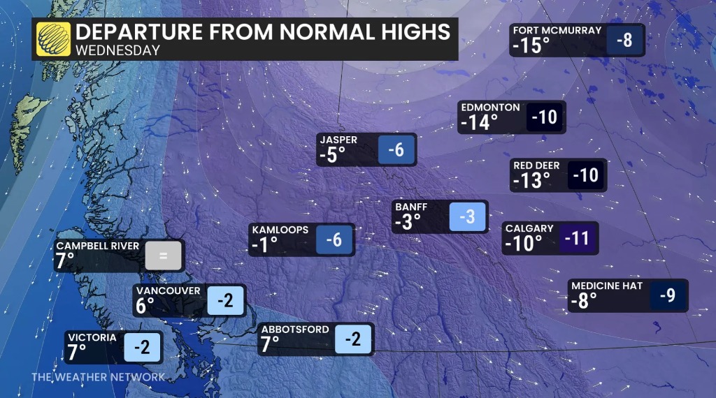 预计随之而来的降温,将使冻结高度下降至高山及南部山口。奥肯那根地区周末可能出现零星雪花,而大规模降雪的风险随后上升。下周夜间冻层可能降至海平面附近,尤其是南海岸地区。