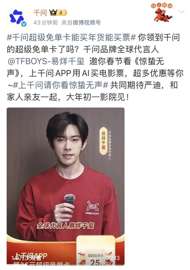 千问刚问世不久,就成功选中了新生代顶流代言人,借其新电影打了一场非常漂亮的春节电影营销之战!