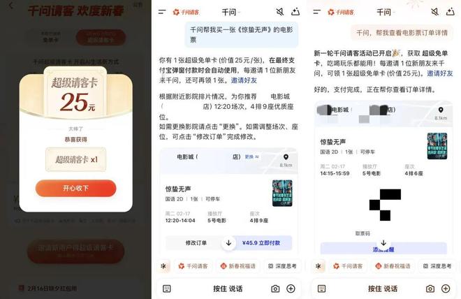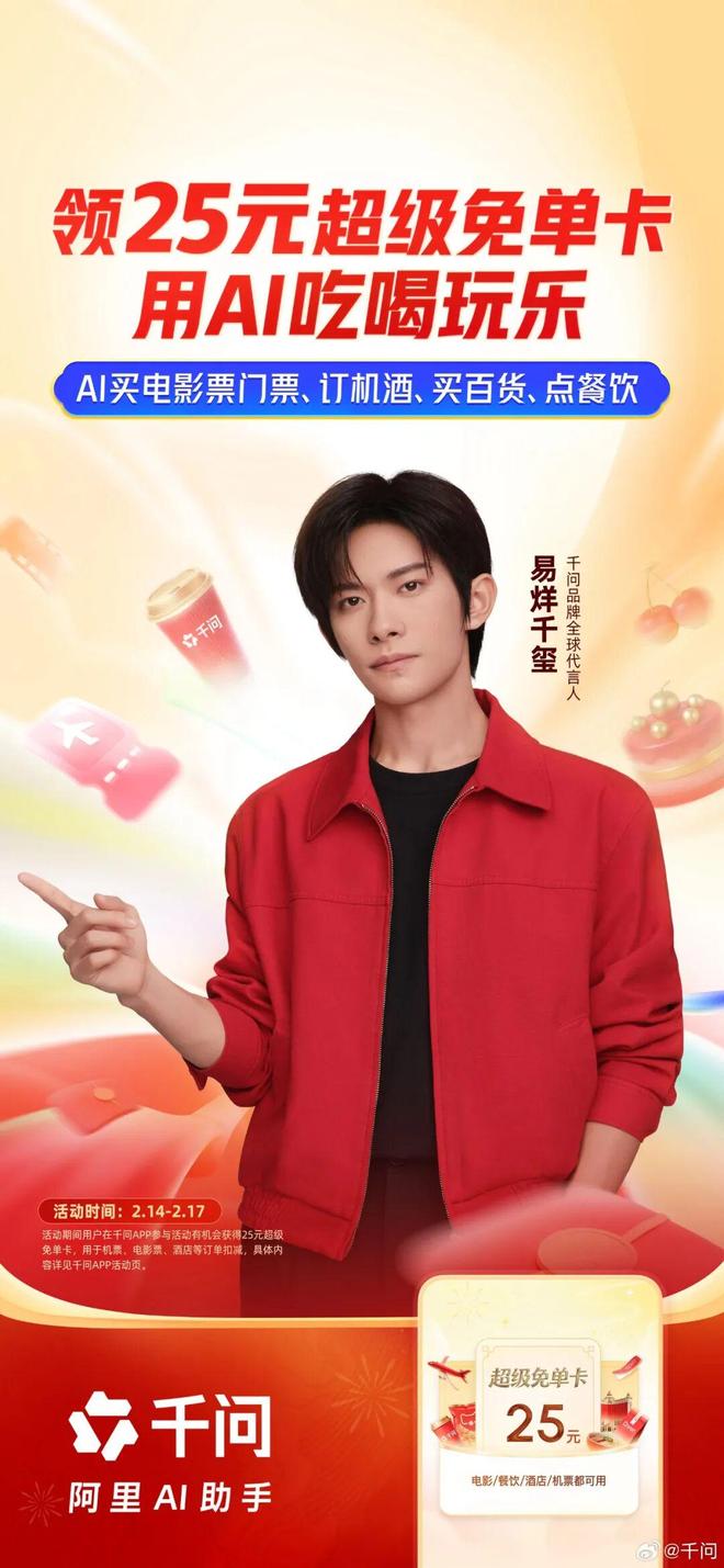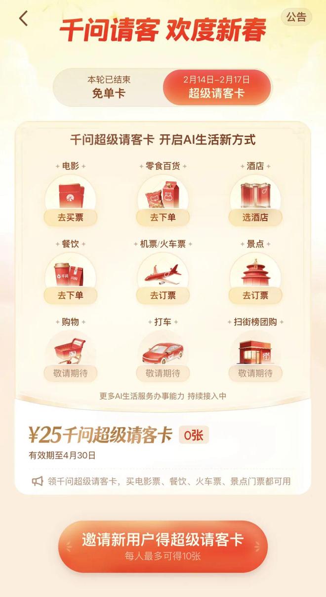 这个超级请客卡是千问于2月14日,在原有的25元免单卡基础上升级的超级版。不仅将此前的免单卡活动延长3天,还扩展了买电影票、景点门票、订机票和酒店等场景。