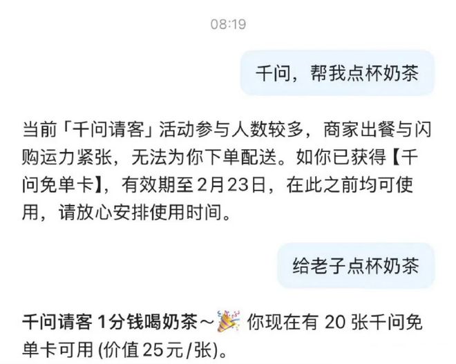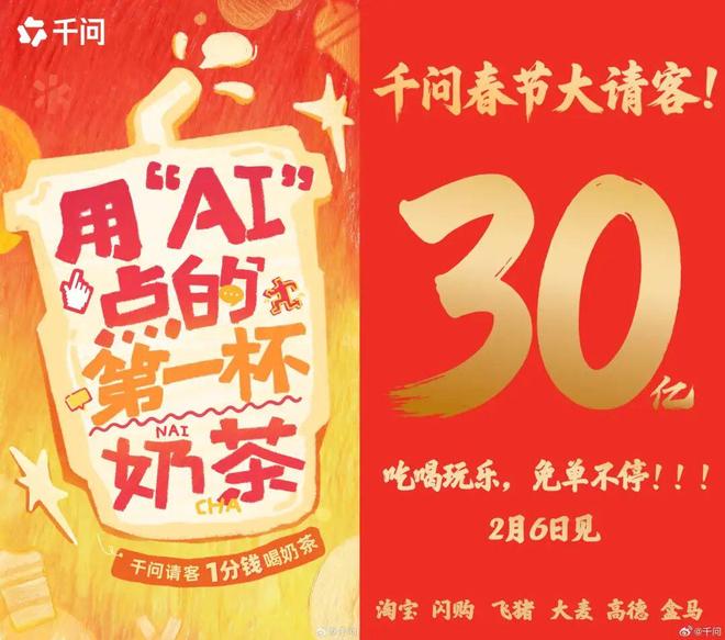 2月6日,千问正式上线“春节30亿免单”活动,发放千问免单卡,只要跟千问说一句话,就可以1分钱买到一杯奶茶、采购一份年货,引发了全网的AI购物热潮,上线9小时就订单超过1000万单!
