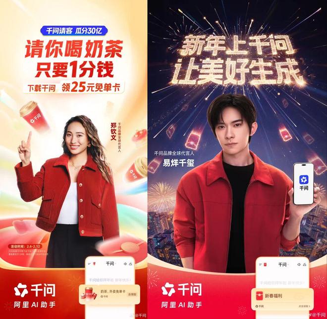 上个月,千问官宣全球品牌代言人郑钦文后,本月又官宣易烊千玺为全球品牌代言人。