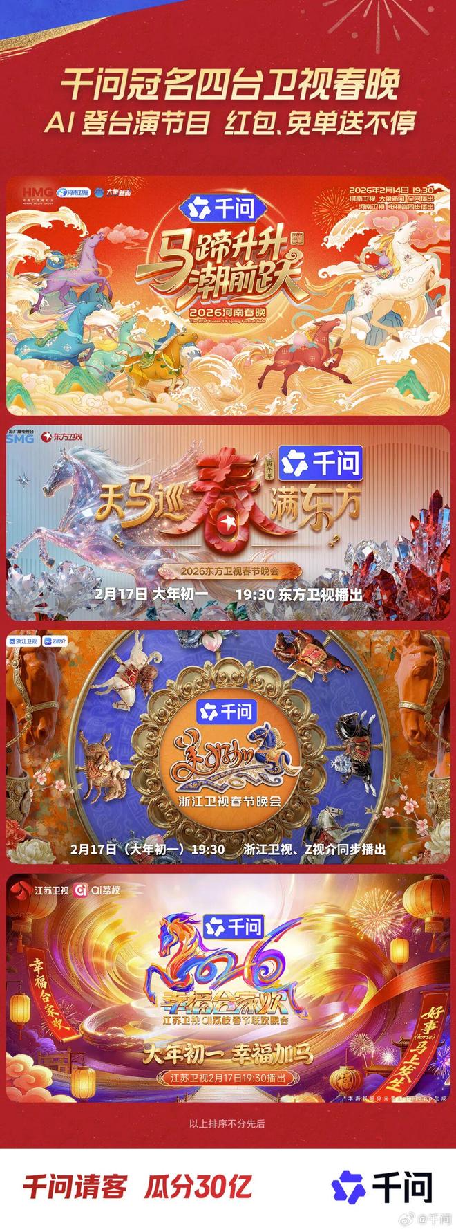 后续千问还一连冠名了四台卫视春晚(东方卫视、浙江卫视、江苏卫视、河南卫视),千问不仅为晚会定制了AI短片,还会直接参与节目录制,在晚会中也会有口令红包等玩法,属实是有创意又有福利。