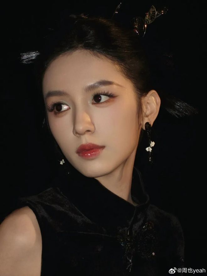 周也在亮相央视网络春晚时,打造的水墨蓝调中式妆令人惊艳。整体运用低饱和色彩在眉眼勾勒出朦胧的水墨感,五官凸显立体感,冷调的水光色豆沙红唇在墨色中点亮,搭配上墨色旗袍贺盘发,宛如一幅晕开的水墨丹青。