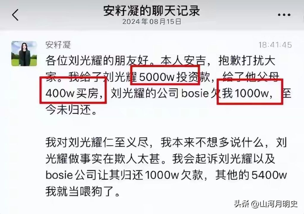 那笔1000万借款,是2023年8月安吉父亲以个人名义借给Bosie的,当时说好是临时救急,可到了争执的时候,这笔钱却被安吉定性成了刘光耀的个人债务。安吉提起这笔钱的时候,语气里满是羞辱,直言自己投的这些钱“喂了狗”。