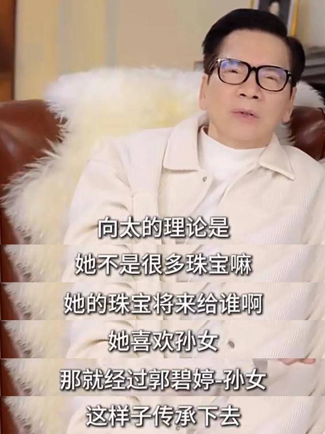 向华强表示,向太收藏的那些珠宝首饰,都会经由儿媳郭碧婷,留给家里的小孙女。