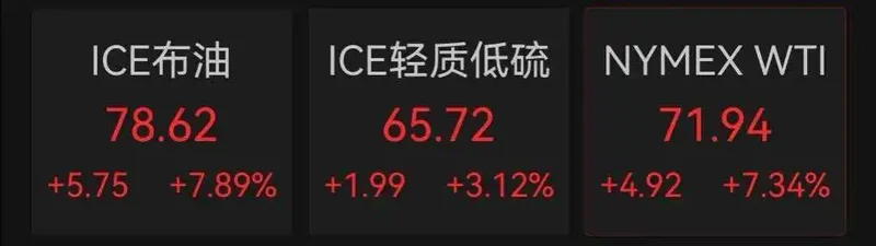 截至发稿,布伦特原油涨近8%,至每桶78.62美元,开盘一度飙升13%。