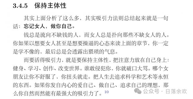 最令人警惕的是他提到的“压力测试”:“进挪要带一点‘冒犯’……我们要通过这种不断的微小冒犯,筛选出那些容易‘搞定’的目标。”这已经游走在法律与道德的灰色地带。它本质上是通过摧毁女性的边界感,来完成一种“顺从性筛选”。在这种逻辑下,女性的自我保护意识被视为程序中的“Bug”,需要通过反复的压力测试来剔除。(这个比喻很到位)