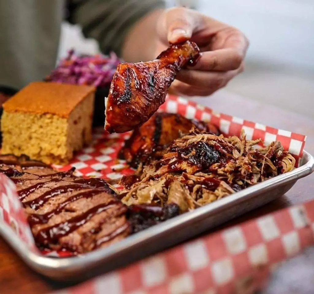 裡面滿滿都是煙熏牛腩、燒烤肋排、煙熏雞肉和煙熏手撕豬肉等, 還可以選擇兩種配菜和兩份玉米面包 (cornbread)。