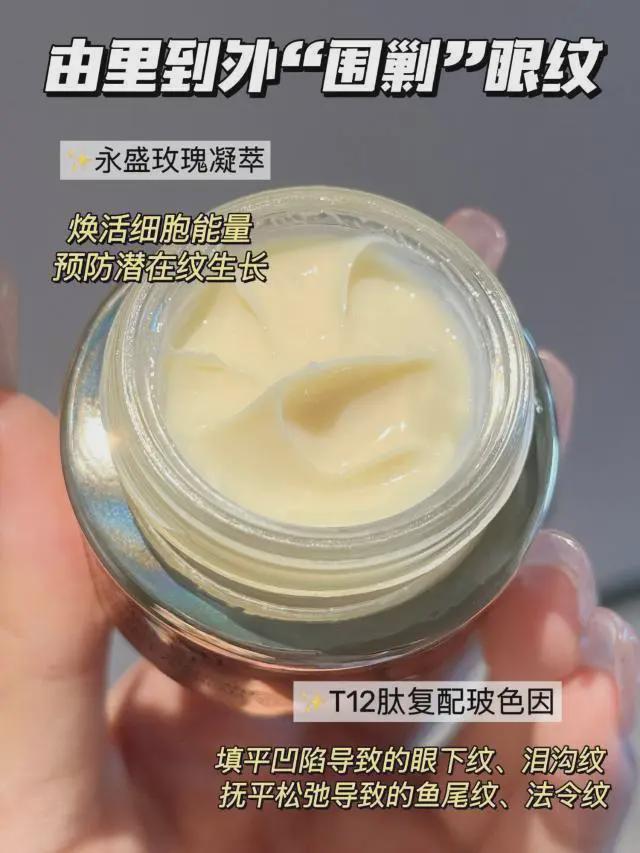 菁純眼霜的核心成分依然是永盛玫瑰凝萃+玻色因,新升級的版本還加了淡紋大佬T12肽復配玻色因,能輕輕松松把眼周凹陷、淚溝托舉撐開再填平!