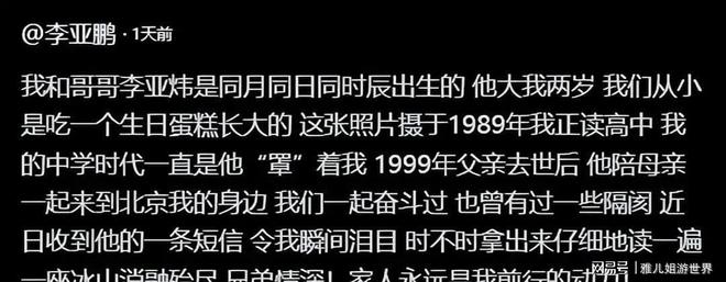 那些年里,李亚鹏在台前光芒万丈,哥哥就在幕后默默兜底,兄弟同心其利断金,他们成为了彼此最坚实的依靠。?