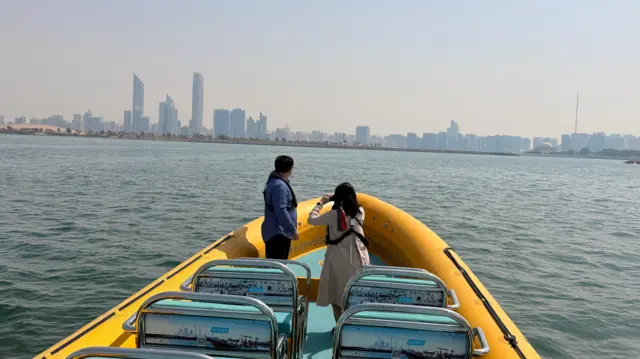 图像加注文字,2月28日战争开打,但消息滞后,台湾旅客Afaf 和邱先生中午还去了阿布扎比港口游船。