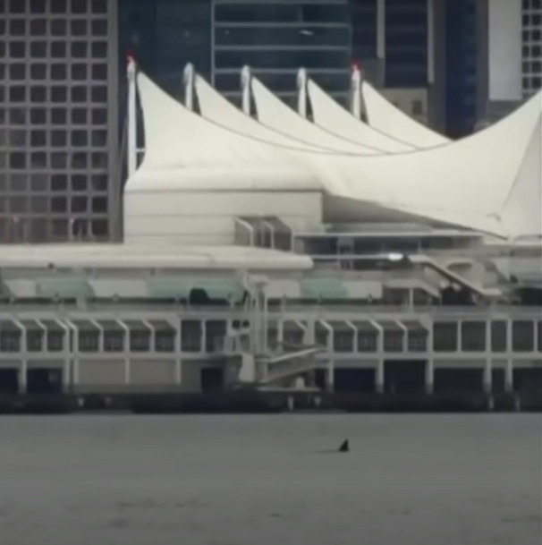其中一张照片中,鲸鱼们在温哥华加拿大广场标志性的帆形建筑前嬉戏玩耍;另一张照片中,它们的身影消失在驶过的海上巴士后面。