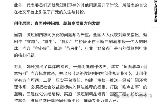 刘素英指出,短剧中“穿越”、“重生”、“复仇”的桥段正在不断冲刷着年轻一代人的眼球,内容“空心症”、算法“茧房化”、行业“野蛮态”是当前微短剧行业的核心问题。对此,她还提出了具体的建议,一是明确创作边界,建立“负面清单+创意指引”内容标准体系,并出台《网络微短剧内容创作规范指引》,让创作者有方向可循;二是’压实平台责任,构建“审核—推送—惩戒”闭环管理体系,必须把社会效益指标纳入算法推荐的权重,打破“唯点击率”的垄断。三是优化供给结构,实施“微短剧精品培育”国家工程。如设立扶持基金,搭建产学研播协同创新平台,推动专业力量入局。