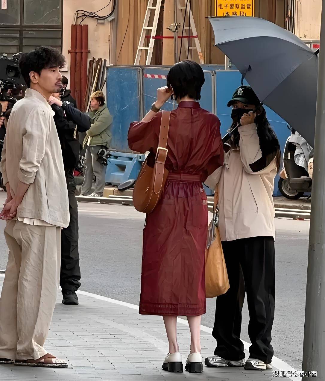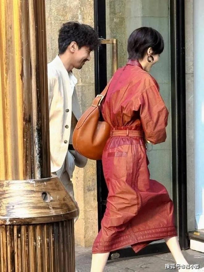 配饰上她只选了焦糖色腋下包+金属圆环耳饰,同色系呼应让整体更协调,没有多余装饰却足够精致。发型依旧是超短发,利落干净,和裙装的飘逸感形成反差,走路时裙摆轻扬,慵懒又随性,像从老电影里走出来的文艺女主,日常通勤或约会都适配。