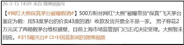 媒体曝光网红大熊用53度茅台的价卖43度的酒,消费者花费2万元购买,到手之后发现不对,经过调查发现,大熊售卖的茅台酒收款、发货、开票都不在一家。