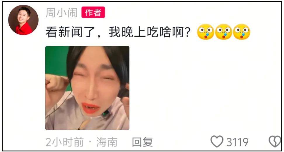 得知刘文祥塌房之后,周小闹评论区都沦陷了,网友纷纷留言调侃,他本人回应了一句“看了新闻,我晚上吃啥啊”,直接与刘文祥割席。