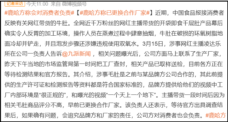 鹿哈则是回应需要核实情况,后续表示早就更换了合作厂家,没有卖问题毛肚了。