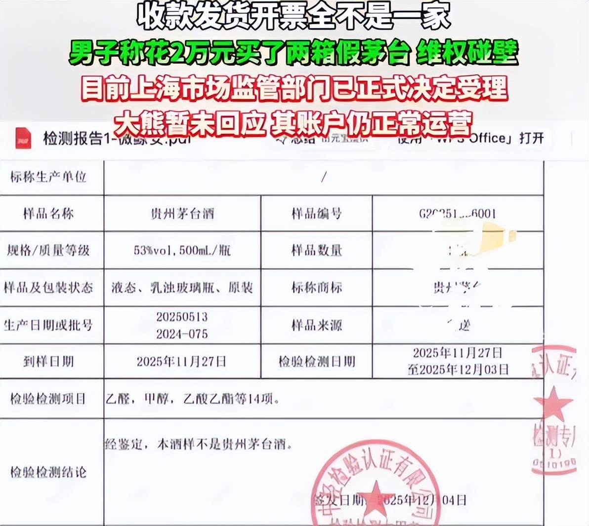 记者拿到了消费者提供的检测报告,显示他买到的茅台酒是假冒产品,了解到相关部门正式受理了网红大熊涉嫌售假的投诉,正在调查中。