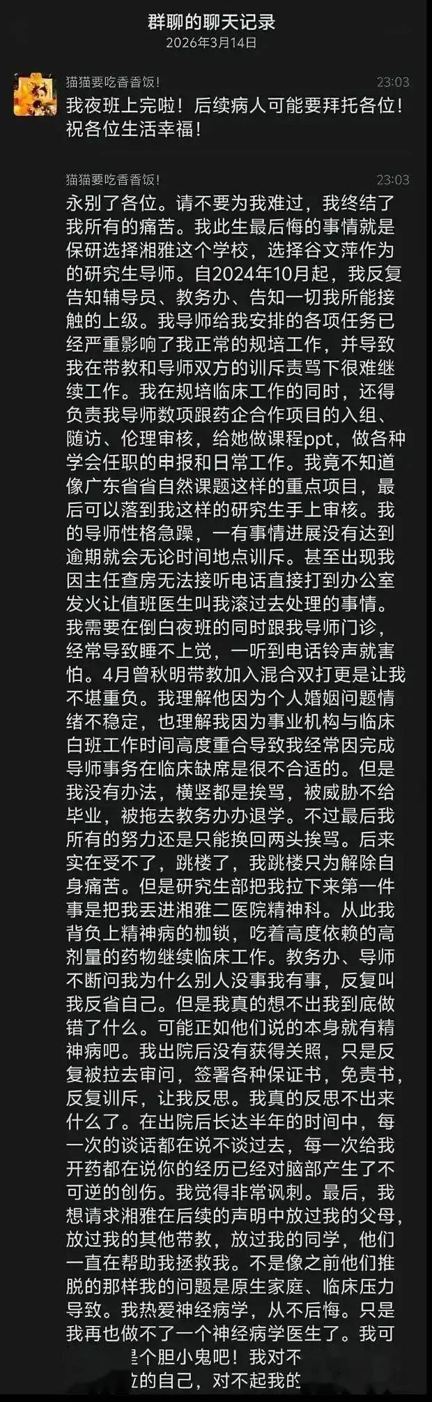 湘雅研究生自杀后续:很漂亮,跳江前遗言直指导师