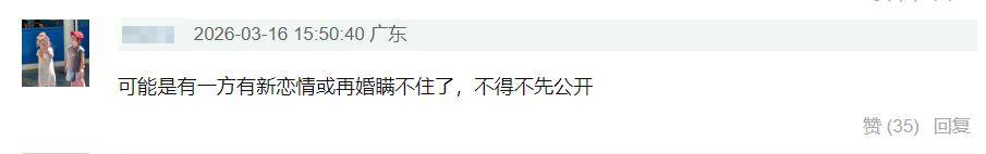 不少網友猜想,離婚幾年,如今卻猛不丁公開,最大的可能是兩人其中有一方感情有了新動向,更有可能是其中一方的新戀情被媒體拍到,所以兩人才會在協商一致後透露離婚實情。