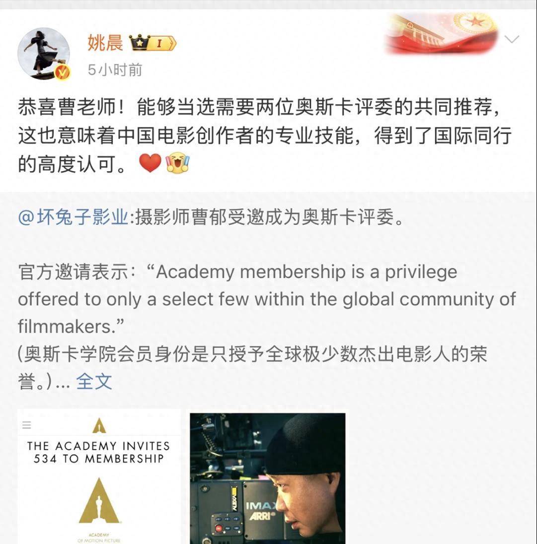兩人當時還毫不避諱的同框出席活動,去年曹郁入選為奧斯卡評委,姚晨還第一時間發文慶祝,口吻與語氣也比較親昵。