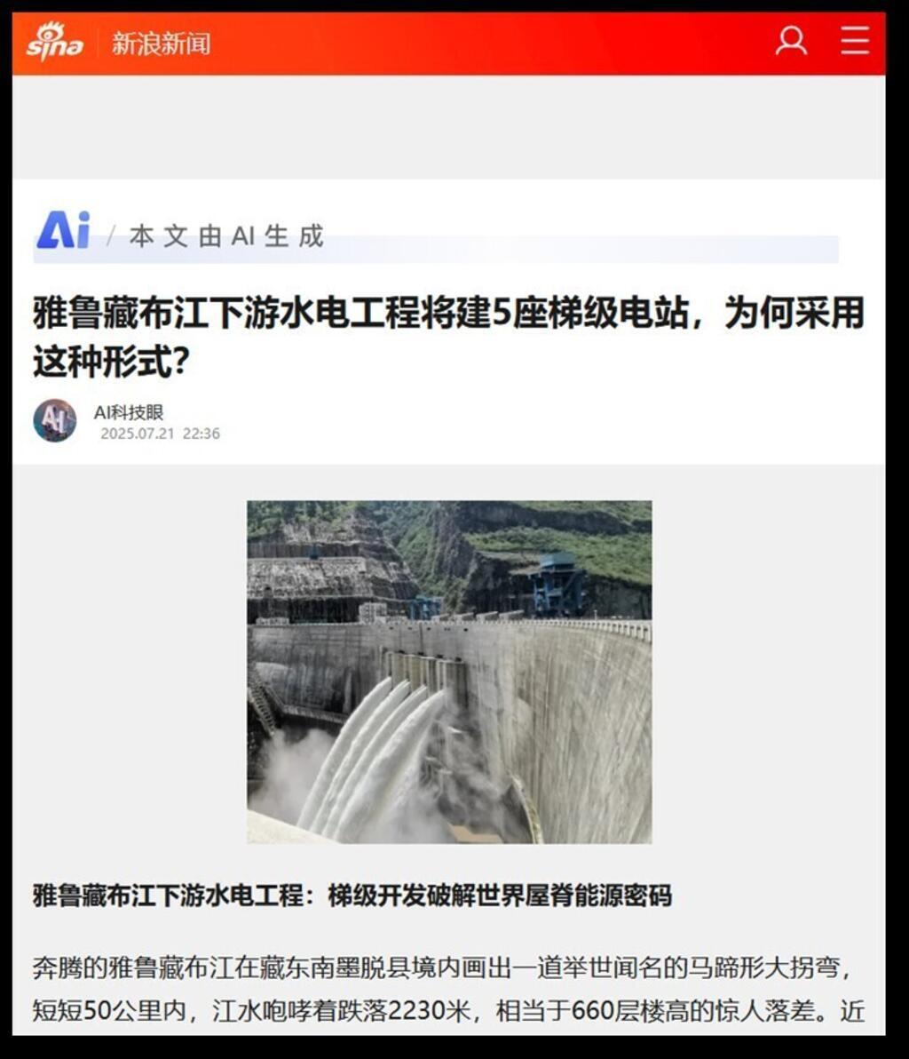 2025年7月19日雅鲁藏布江下游水电工程的开工仪式在米林水电站坝址举行。7月21日《新浪新闻》刊登题为《雅鲁藏布江下游水电工程将建5座梯级电站,为何采用这种形式?》的文章。文章注明:本文由AI生成。