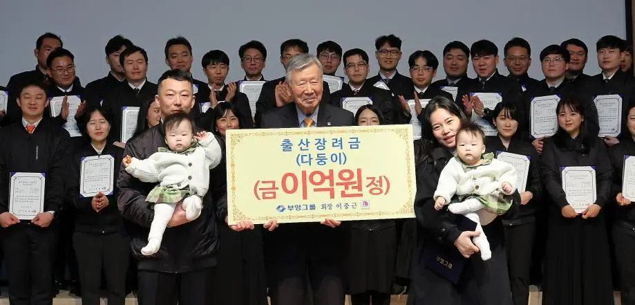 △2024年2月5日,富荣集团会长李重根向养育双胞胎姐妹的职员吴贤石一家发放2亿韩元的生育奖励金,并合影留念。(图源:《东亚日报》)