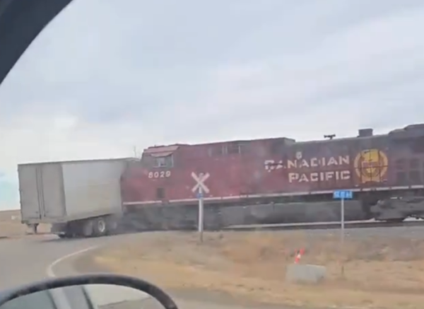 加西网编译报道:社交媒体上流传的视频显示了让人震惊的情景,在加拿大阿省南部,一列火车撞穿了一辆半挂车牵引的车厢。