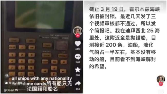 3月11日,上述抖音帐号曾发布视频,显示一艘中国货船因为物资耗尽,打算冒险闯过海峡,货船负责人在远程通话中询问同事“是白天过安全还是晚上过安全”。