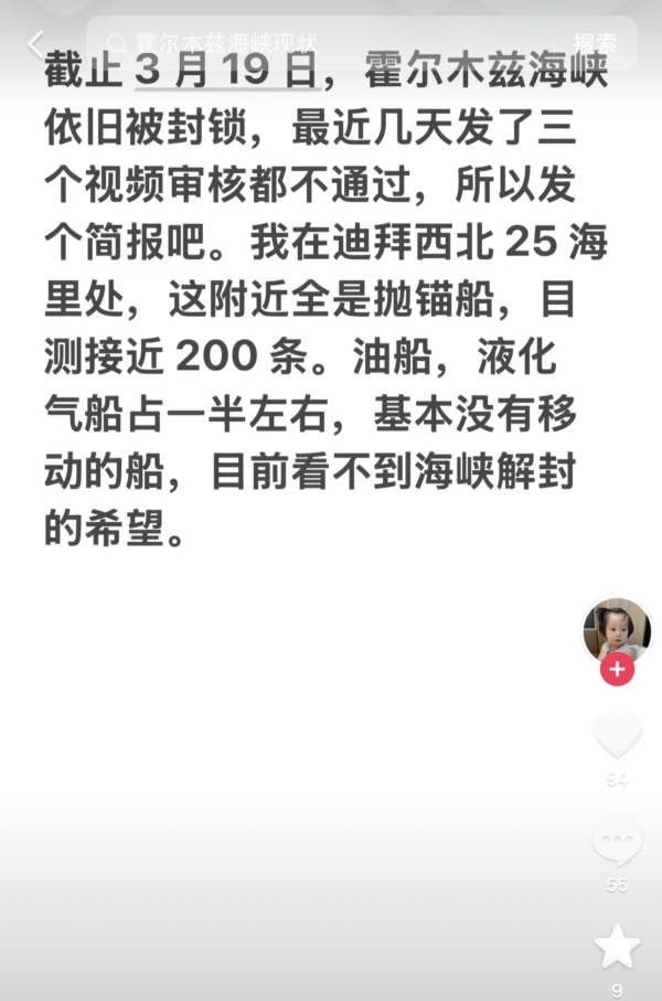 这名中国船员在抖音视频接连受限,疑似因不符合中共叙事。目前北京当局正操控舆论,在社交媒体上大肆营造“中国船只在霍尔木兹海峡畅通无阻”的假象。外界分析,这种造假宣传,一方面可骗取中国小粉红的“大国自豪感”,另一方面可抵消美国总统川普要求中共护航霍尔木兹的舆论压力。