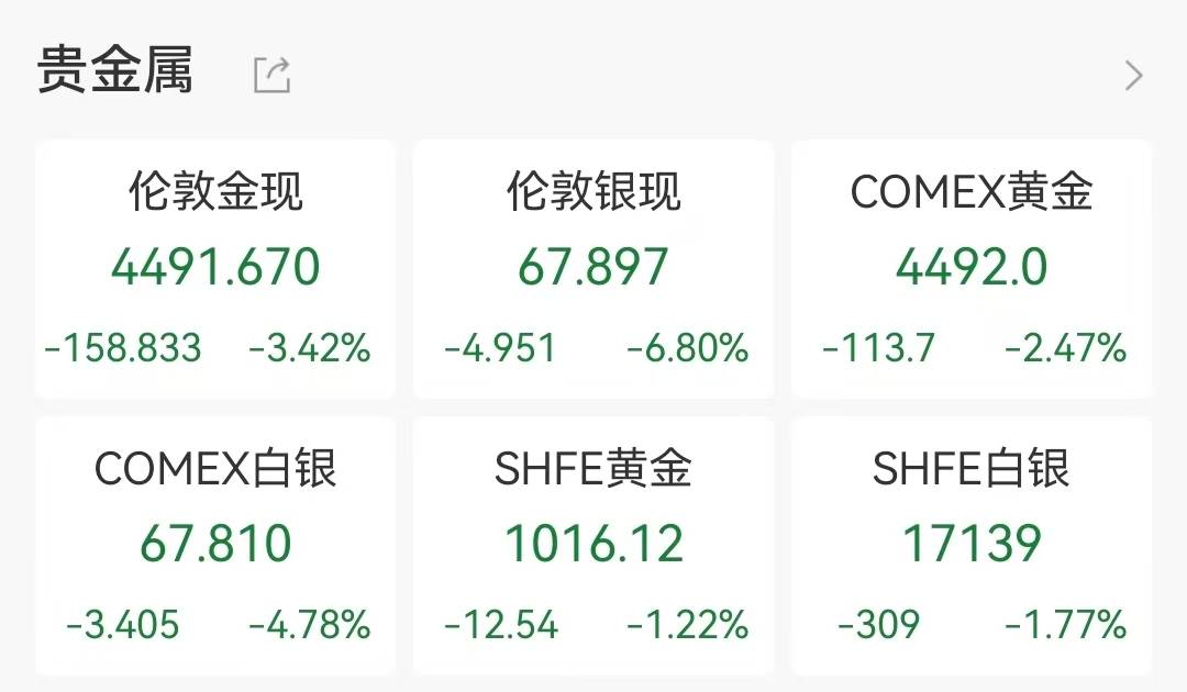 贵金属深夜跳水,现货黄金大跌3.42%,失守4500美元大关;现货白银跌6.8%,报67.897美元/盎司。