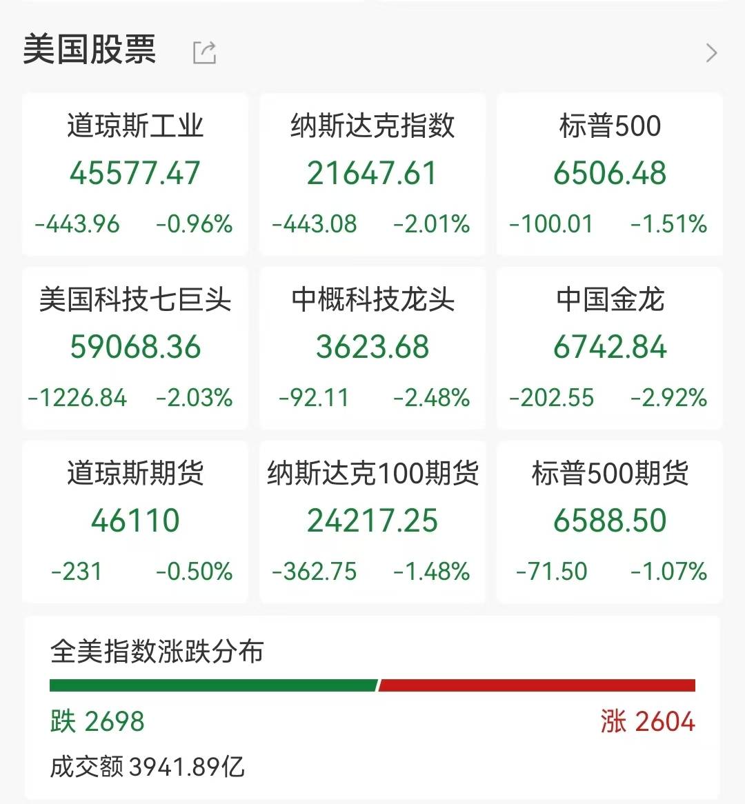 美股科技“七巨头”集体下跌,英伟达跌3.28%,苹果跌0.39%,谷歌C跌2.27%,微软跌1.84%,亚马逊跌1.63%,Meta跌2.15%,特斯拉跌3.24%。