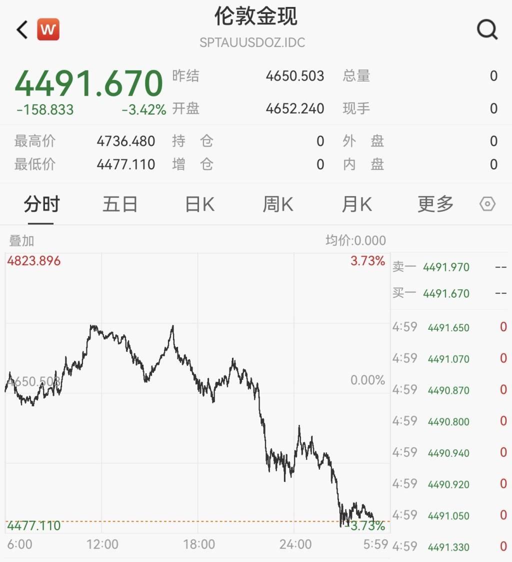 现货黄金价格跌破4500美元,创43年最大单周跌幅。