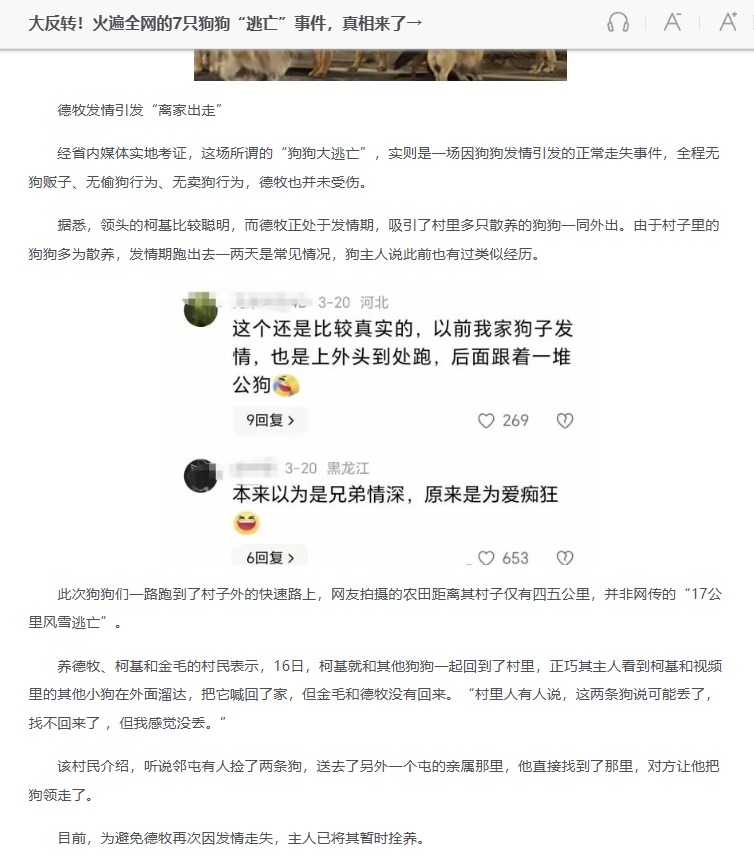 狗主人解釋稱,並不存在“盜狗團伙”,事情起因是一只發情的德國牧羊犬帶著村裡的幾只狗“集體出走”。所謂“17公裡逃亡”也不屬實,實際距離不到4公裡,且並無受傷情況。