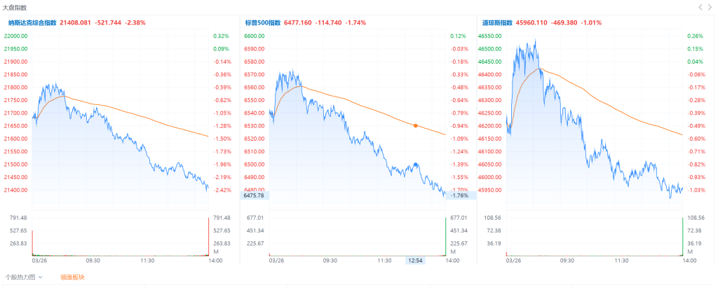 道指跌470.12點,跌幅為1.01%,報45959.37點;納指跌521.74點,跌幅為2.38%,報21408.08點;標普500指數跌114.78點,跌幅為1.74%,報6477.12點。